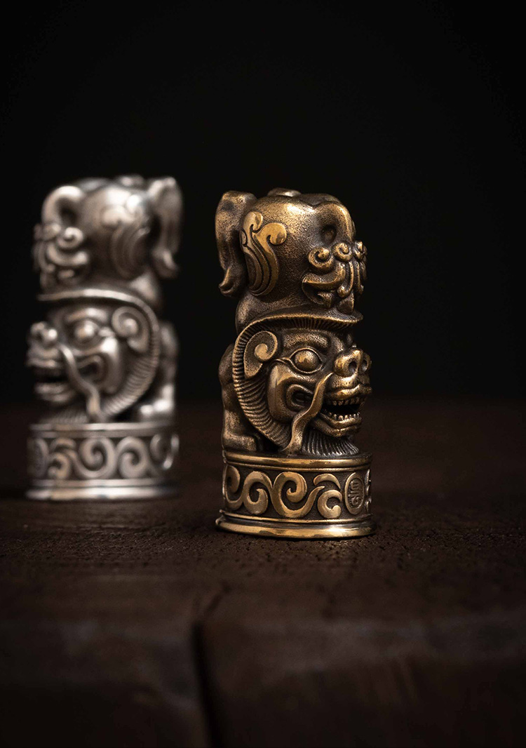 印の頂には、チベット仏教における護法神獣「雪獅子」を彫刻。たなびく鬣と鋭い眼差しは、清らかで恐れを知らぬ力の象徴です。