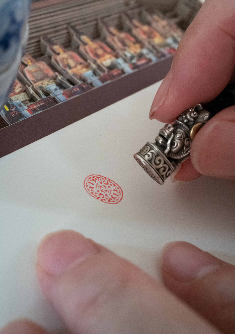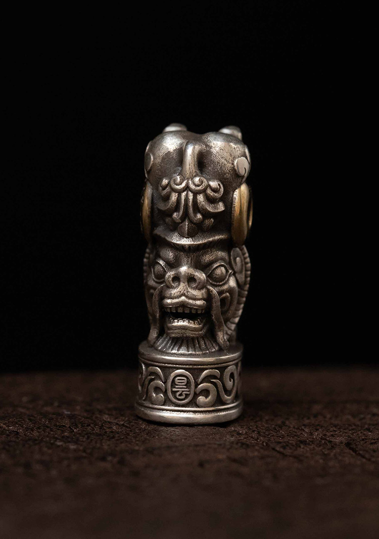 印の頂には、チベット仏教における護法神獣「雪獅子」を彫刻。たなびく鬣と鋭い眼差しは、清らかで恐れを知らぬ力の象徴です。