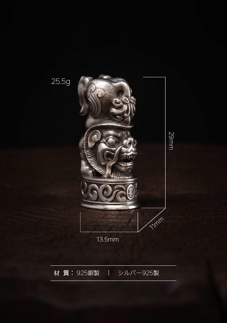 【チベット雪獅子法印】を意匠の源とし、 その精髄を汲み取り、余計な装飾を排して、静謐かつ威厳ある姿へと昇華させました。形は簡潔ながら、内に秘めた気品と荘厳さが漂います。