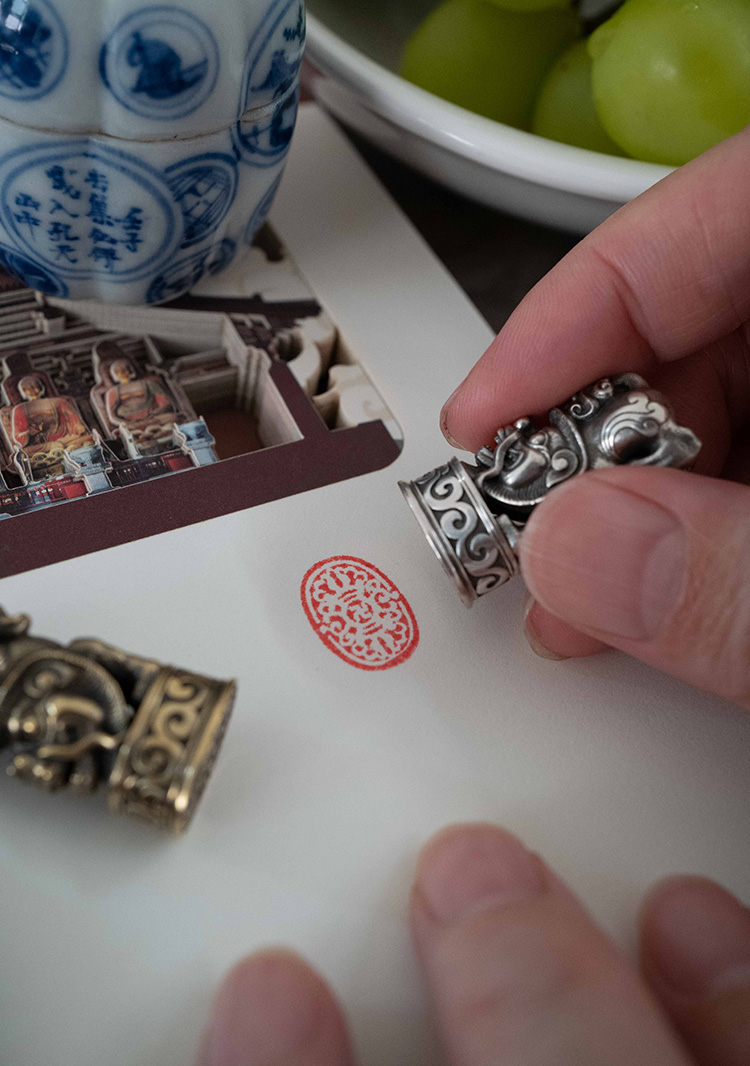 印の頂には、チベット仏教における護法神獣「雪獅子」を彫刻。たなびく鬣と鋭い眼差しは、清らかで恐れを知らぬ力の象徴です。