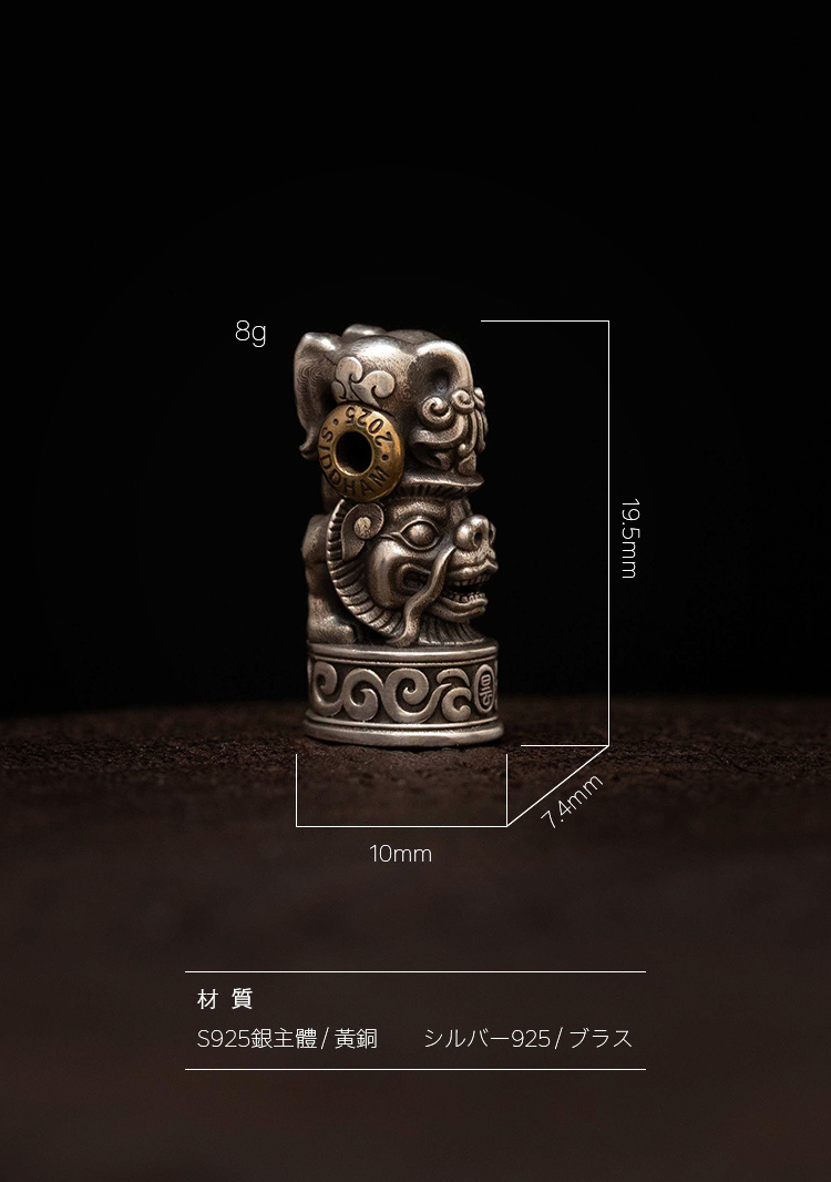 【チベット雪獅子法印】を意匠の源とし、 その精髄を汲み取り、余計な装飾を排して、静謐かつ威厳ある姿へと昇華させました。形は簡潔ながら、内に秘めた気品と荘厳さが漂います。