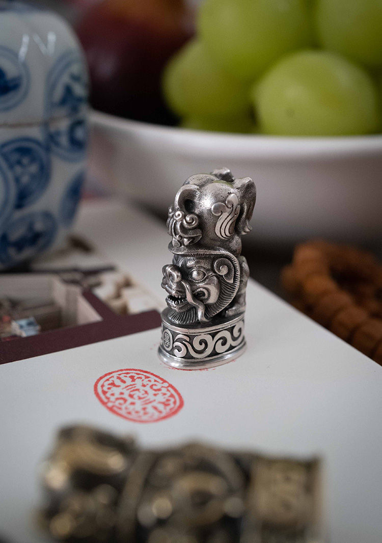 印の頂には、チベット仏教における護法神獣「雪獅子」を彫刻。たなびく鬣と鋭い眼差しは、清らかで恐れを知らぬ力の象徴です。